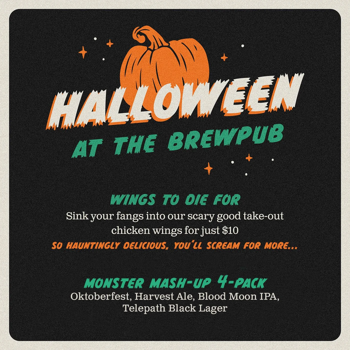 Things are getting spooky on Buffalo Road. Grab take-out wings for just $10 and pair them with our seasonal Monster Mash-Up 4-Pack featuring Oktoberfest, Harvest Ale, Blood Moon IPA, and Telepath Black Lager. The perfect combo for a haunted night in—or a late-night monster marathon.